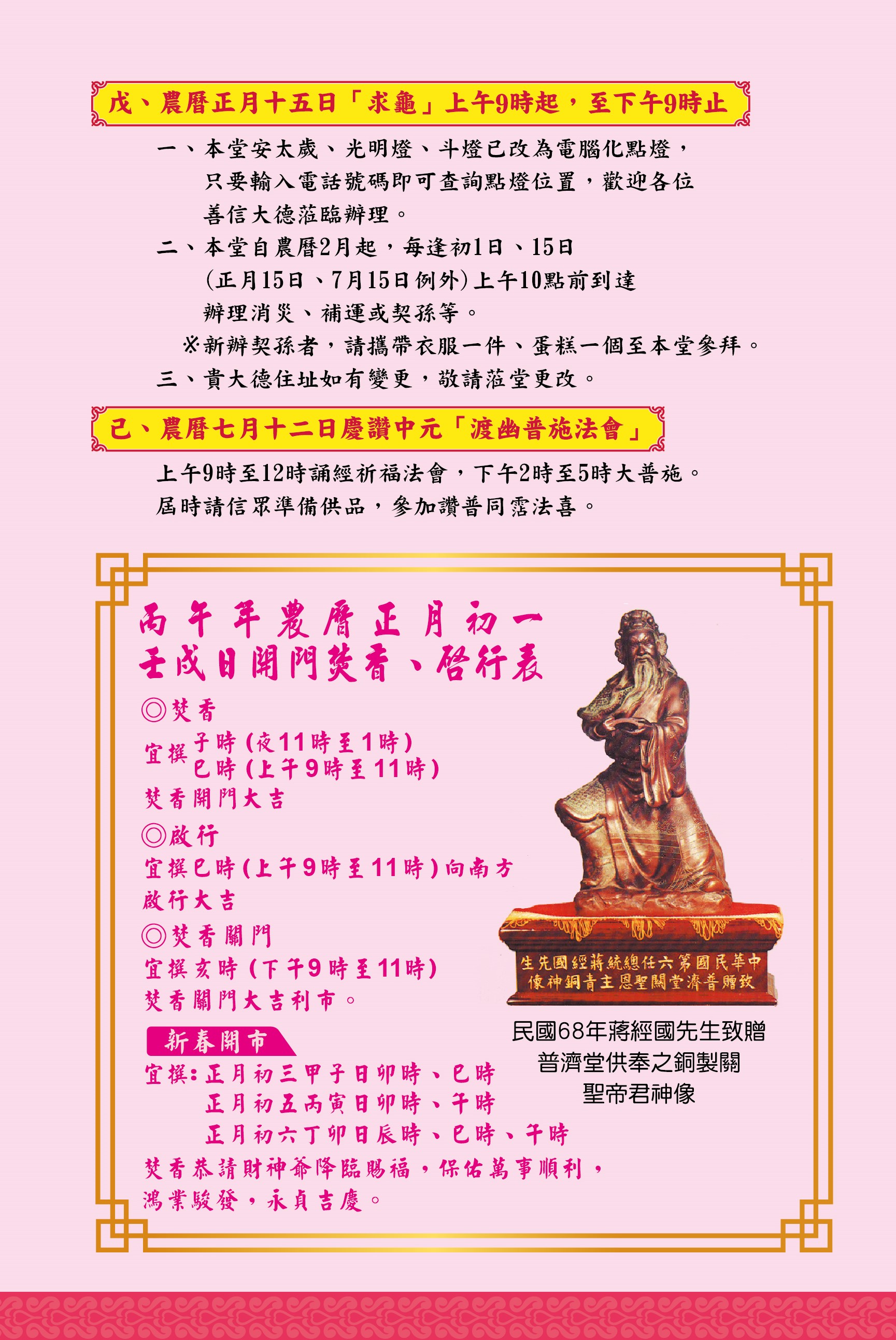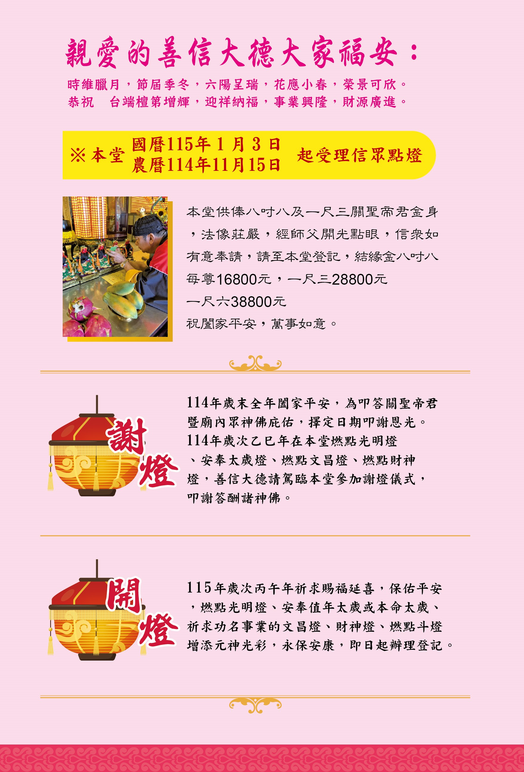 2025-12-28 點燈登記・信眾相關諮詢事項 各位信眾大德平安: ►丙午年行事曆已經寄出囉!請大家多加留意本堂接下來的重要活動。 ►點燈登記 將於 農曆十一月十五日 (國曆115年1月3日) 起開始受理,歡迎信眾現場或網路登記,祈求闔家平安、光明順遂。 ►信眾相關諮詢事項 自即日起,請移至 本堂辦公室洽詢,由 本堂幹事 簡女士 親切為您服務與說明。 感謝大家一直以來對大溪普濟堂的支持與護持 祝福大家 平安順心、吉祥如意 回上一頁