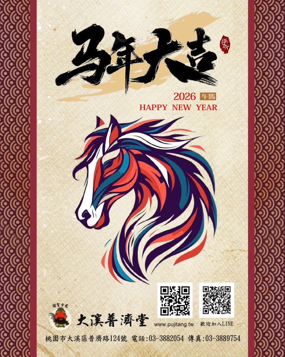 2026-02-13 金馬奔騰迎新歲 金馬奔騰迎新歲.神恩廣佑福滿堂馬年將至,喜迎新春! 大溪普濟堂誠摯恭祝十方善信大德: ♦ 馬到成功 ♦ 財源廣進 ♦ 闔家平安 ♦ 萬事順遂除夕夜子時(晚上12點)準時開廟門! 鐘鼓齊鳴迎新歲,與眾善信一同接春納福、祈求來年平安順利。開廟門現場結緣發放發財金 1,500 份 數量有限,發完為止,歡迎善信大德踴躍蒞臨,共沐神恩、喜迎財氣。 新的一年,願如駿馬奔騰、昂首向前;在神明庇佑之下,家業興隆、事業騰達、福慧雙增。 新春期間歡迎前來參香祈福、點燈安太歲,為全家點亮平安吉祥的一年。 回上一頁